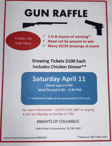 Knights of Columbus Council 1042 is hosting a Gun Raffle on Saturday, April 11 at 1308 W Main St, Greensburg. Doors open at 4 PM, with the meal served from 5:00–6:30 PM.